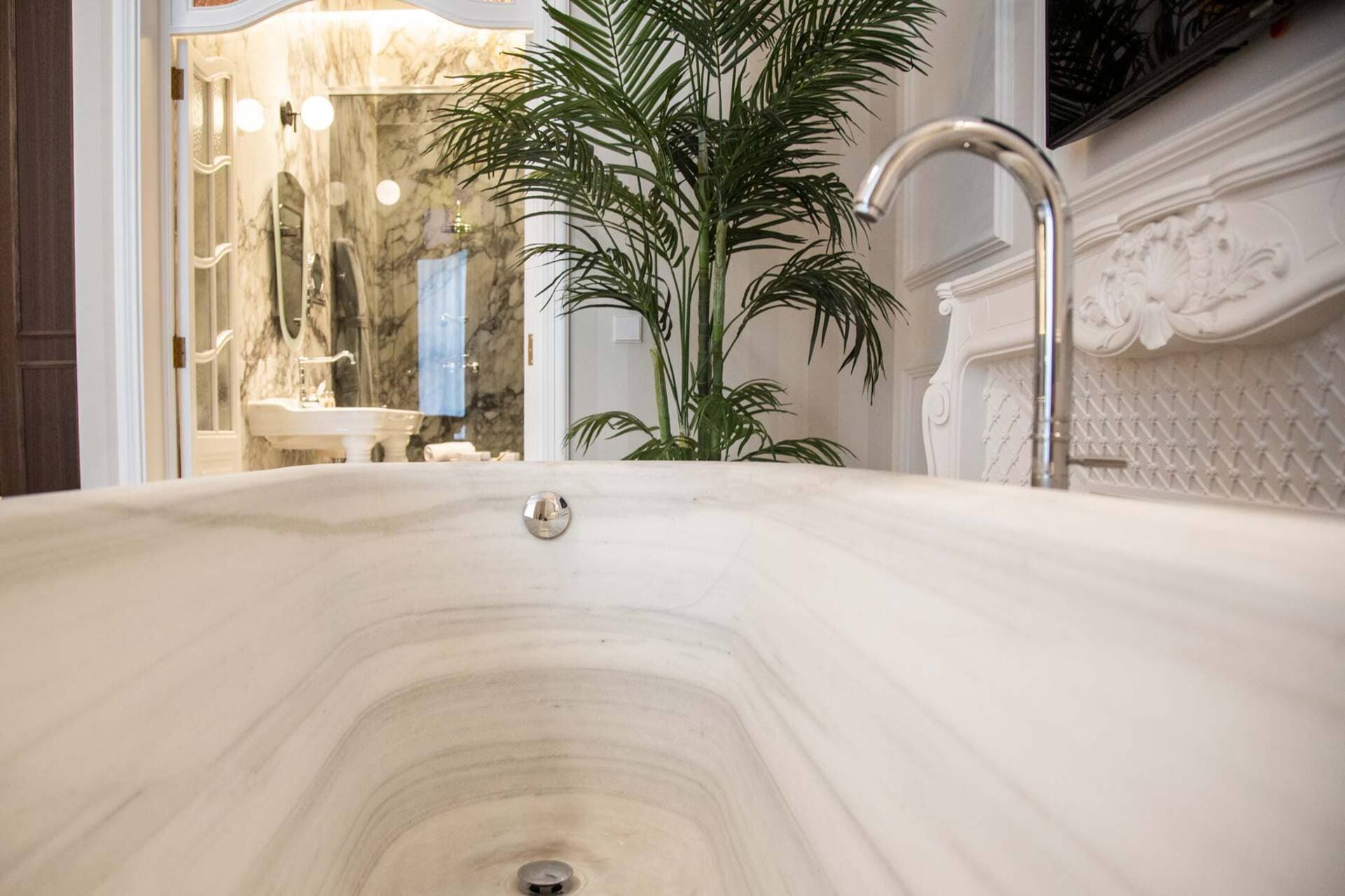 Su baño es una declaración de sofisticación: una impresionante bañera exenta de mármol preside el espacio, ideal para quienes buscan una experiencia de lujo relajante y exclusiva.