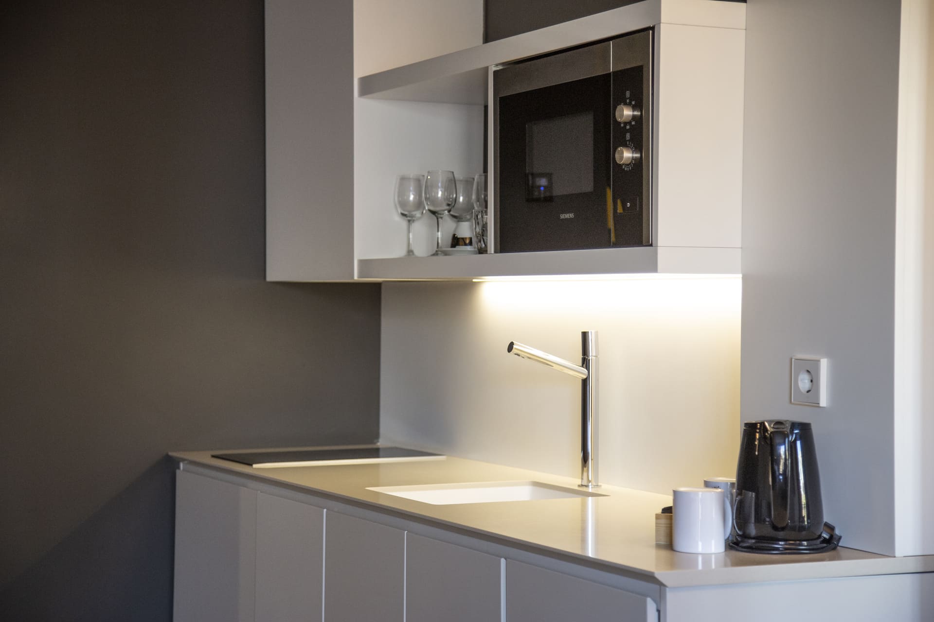Cada suite cuenta con una cocina totalmente equipada, diseñada para que disfrutes de la independencia y comodidad de estar en casa, con todos los utensilios y electrodomésticos que puedas necesitar durante tu estancia.